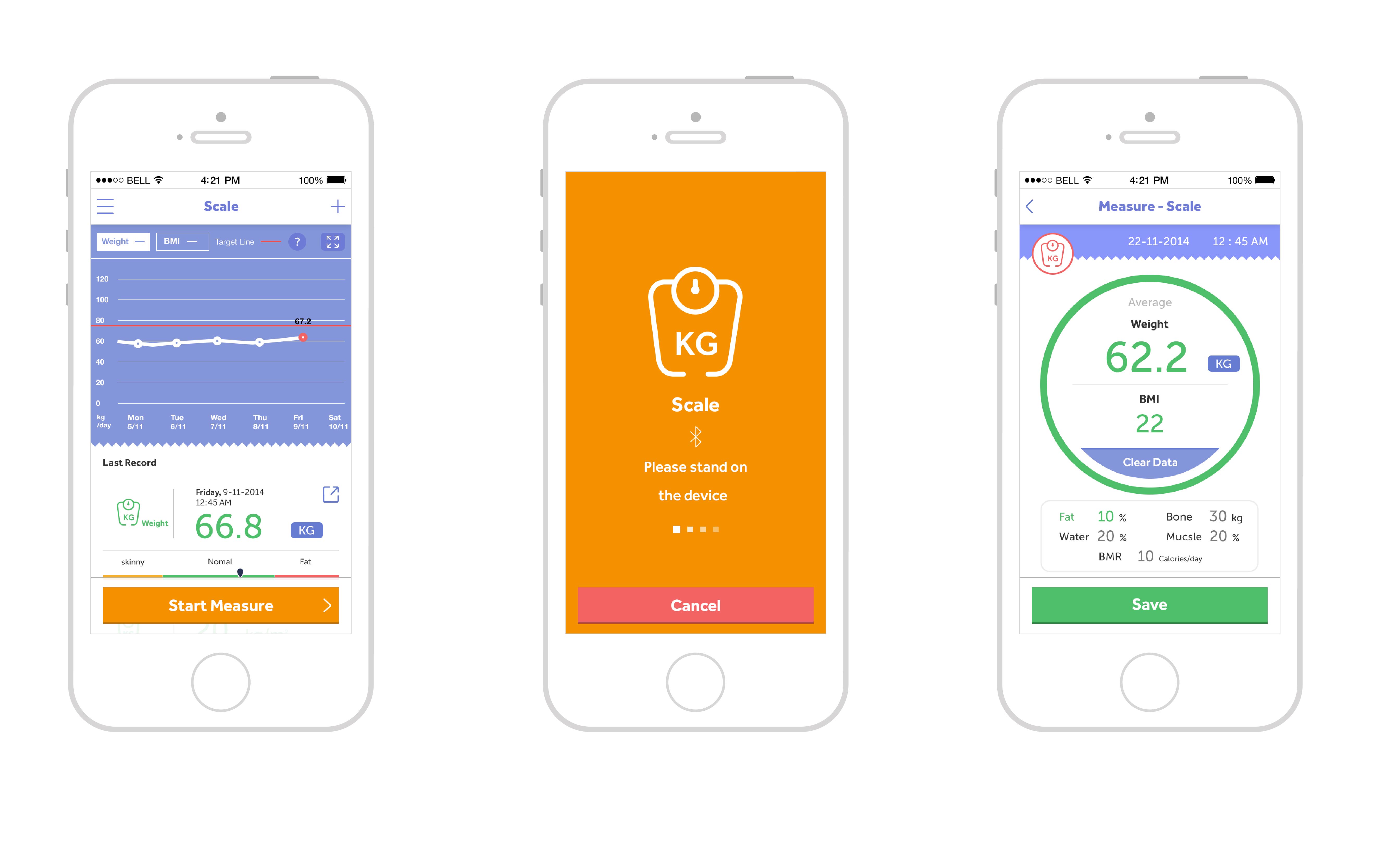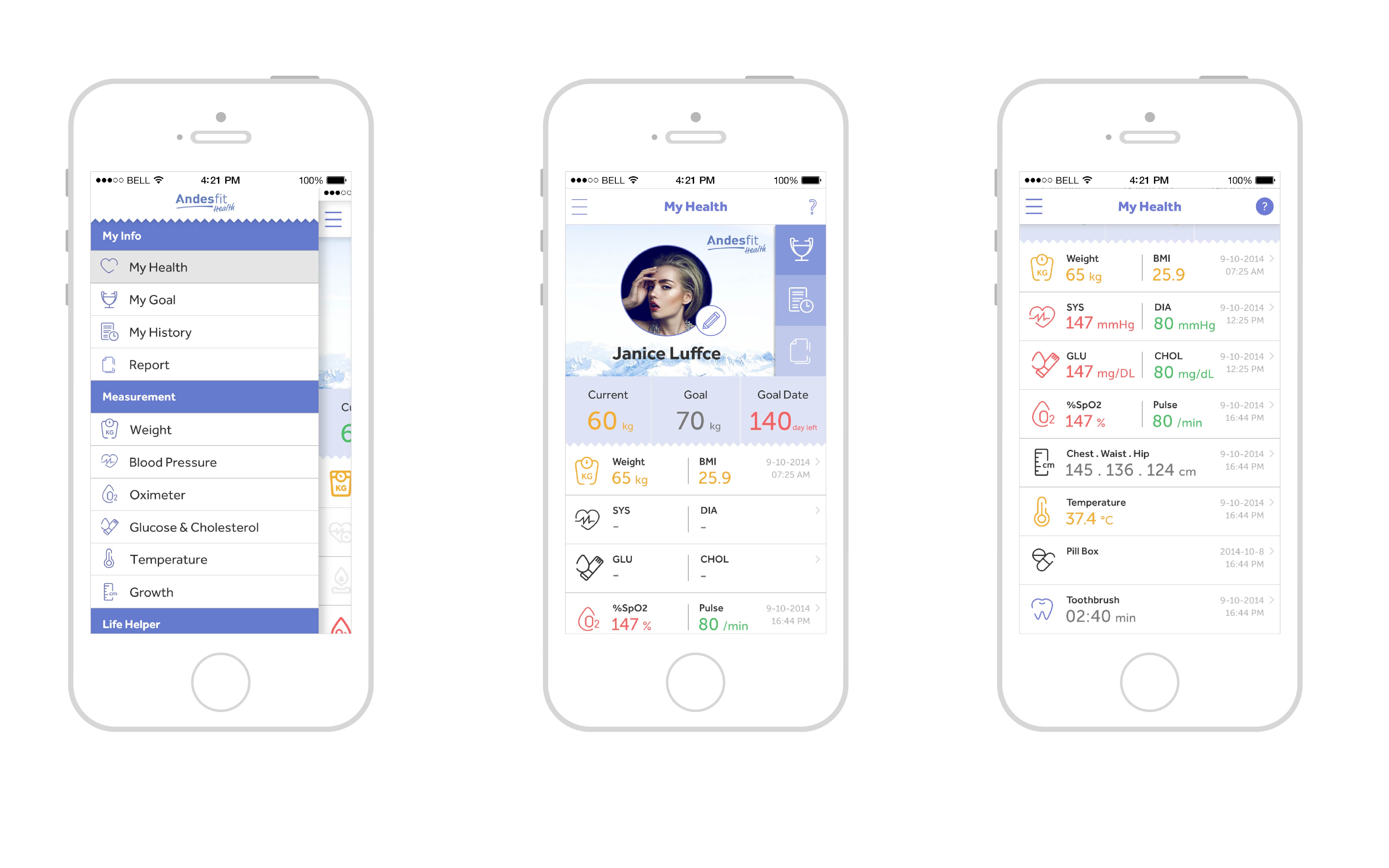 This is a health app for people to record their health status, including scale, blood pressure, and so on, which uses blue tooth to connect with hardware. And it really achieves what combination of software and hardware is. When I picked up this project, everything in the app was ready except from the icons. Since there are so much icons in this app, I tried to give every icons a feature to make themas a family, which is the little gap.